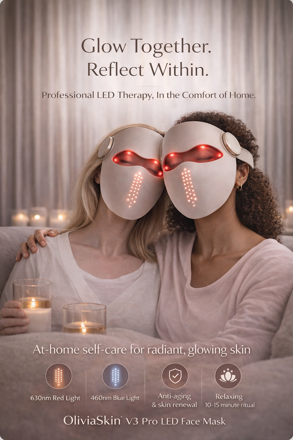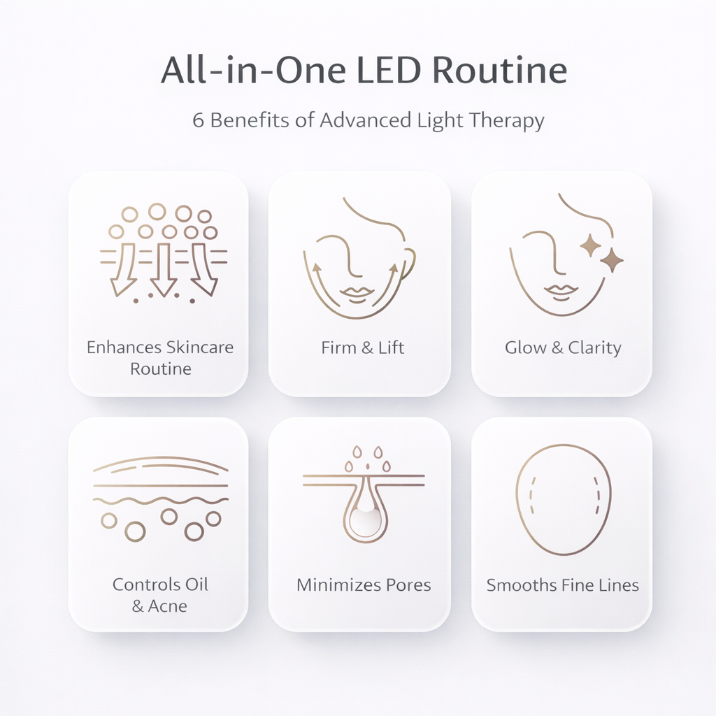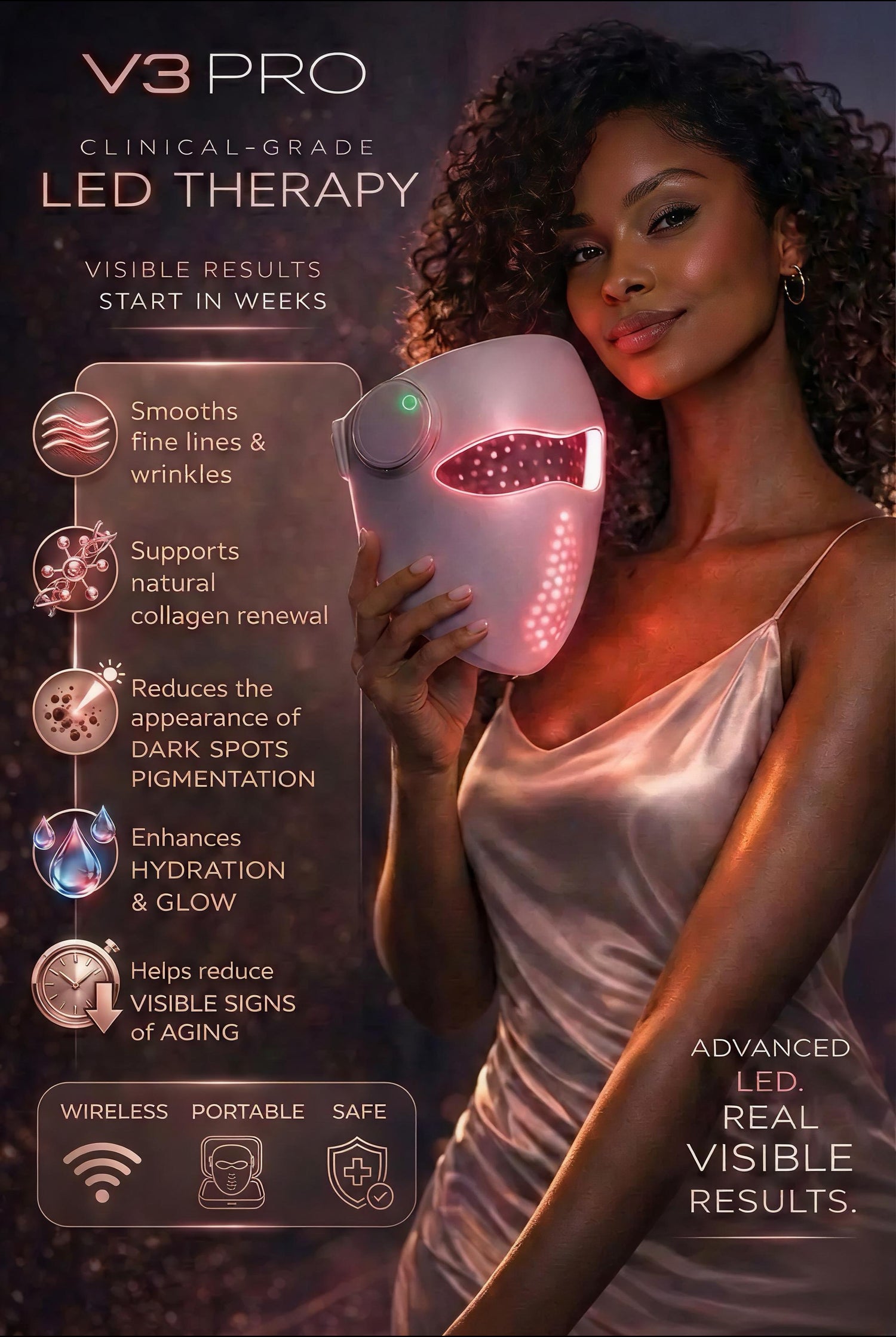 A premium, at-home light therapy experience that combines precision wavelengths with a comfortable, skin-safe fit — designed for smoother-looking texture, a firmer feel, and a brighter overall appearance with consistent use.