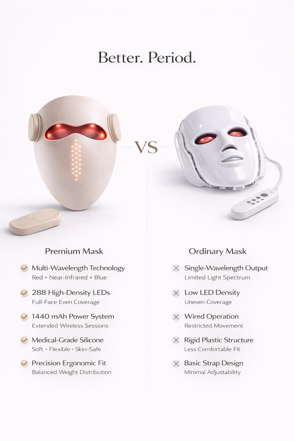 V3 Pro is engineered with higher LED density, balanced light dispersion, medical-grade materials, and cordless control — delivering refinement without compromise.